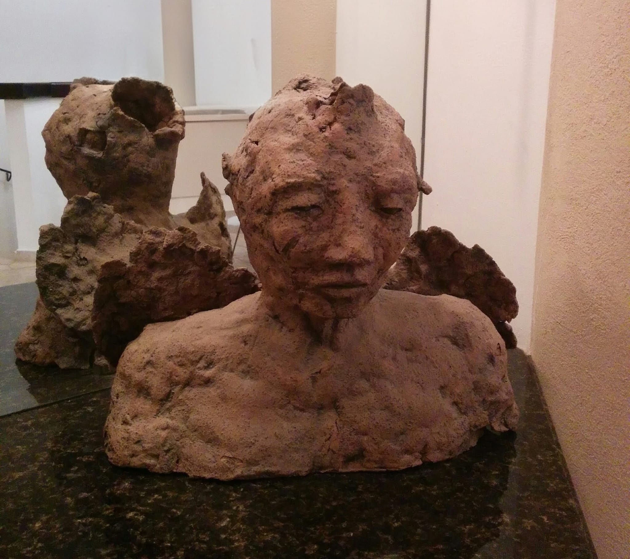 Every work is individual, I used different clay as if each work is claiming it’s personal material. In some of the sculptures I mixed newspapers in the clay to get a rough texture. The works were burned in very high temperature.